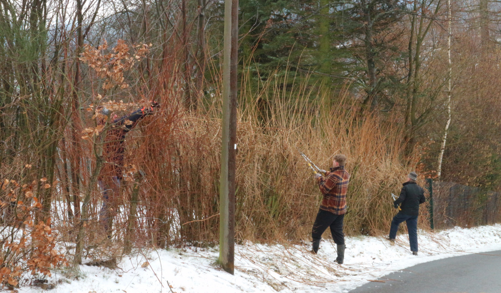 Aber die fast eisig zu nennenden Temperaturen und an Regen grenzender Schneefall waren kein Hindernis für unsere freiwilligen Helfer, sich zur ersten Streuobstwiesenaktion in diesem Jahr zu treffen. Die Auflage der Stadt Sebnitz, die Straßenhecke kurz zu halten, musste auf jeden Fall erledigt werden. Das gelang, wie man sehen kann.