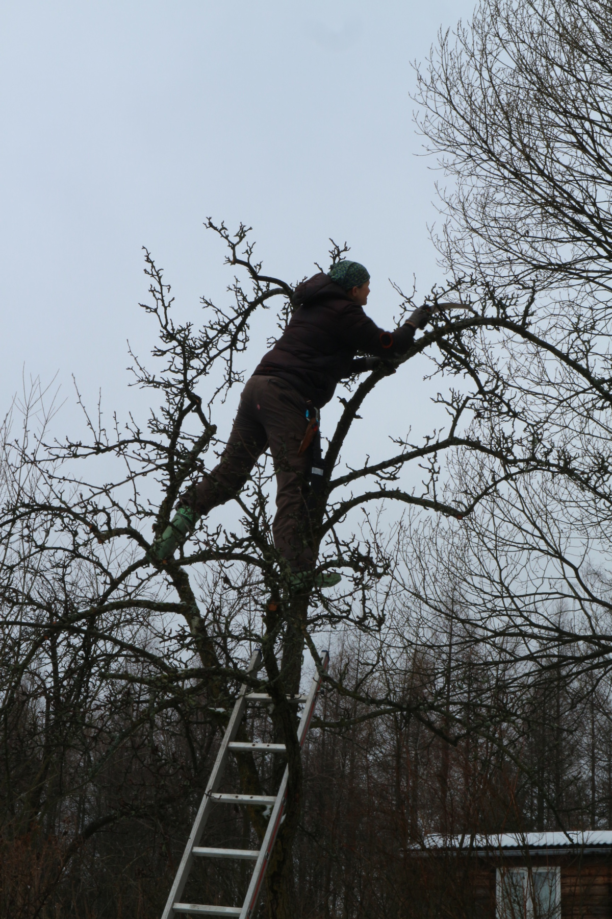 Aber auch Bäume konnten fachgerecht beschnitten werden, denn eine Expertin hat sich vor kurzem unserer Gruppe angeschlossen. Wir freuen uns besonders, dass sie und eine weitere Familie als neue Mitglieder an diesem Tag dabei waren. Nebenstehende akrobatische Übung wird an einer über 30 Jahre alten Quitte vollbracht und wir hoffen, dass dieser Baum wieder richtig zu Kräften kommt.