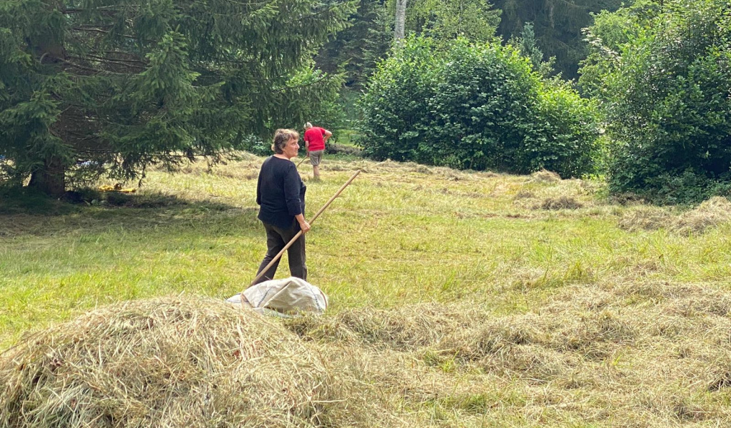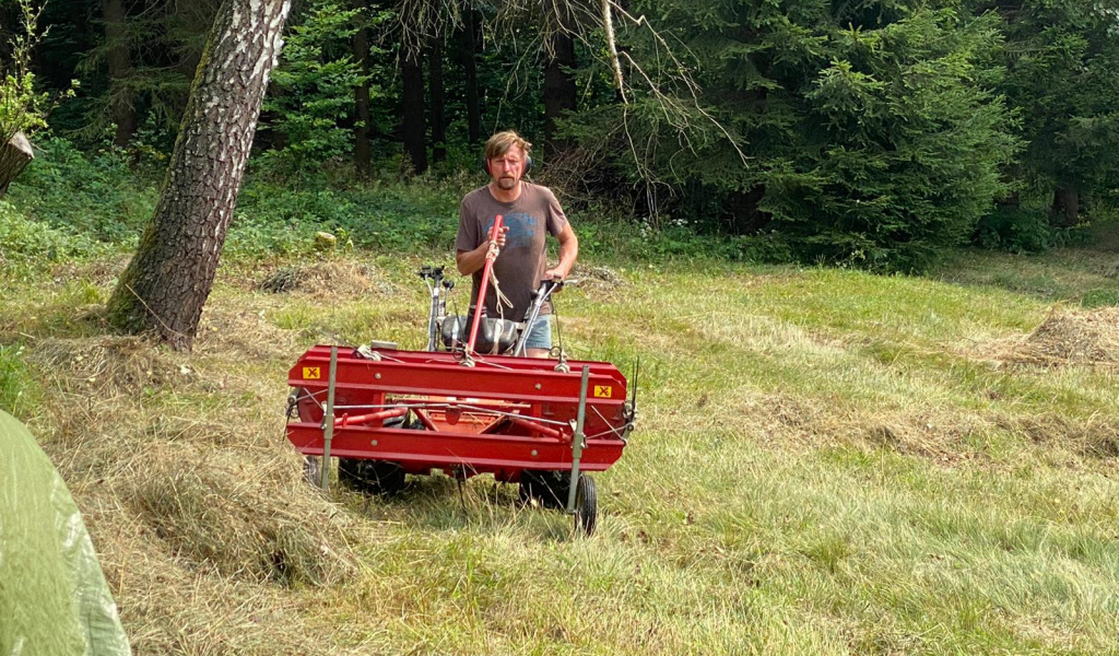 Mitte August war es soweit. Das Wetter stimmte, die Orchideenwiese konnte gemäht werden. Wieder fanden sich einige Helfer aus unserer Gruppe, die dafür sorgten, dass mindestens 15 m³ Heu gemacht und zusammengetragen werden konnten. Das Heu wurde zur Freude einer Familie für deren Pferde zur Verfügung gestellt. Auf der Wiese stehen neben der in einem vorhergehenden Artikel erwähnten Orchideenart Breitblättiges Knabenkraut auch das Große Zweiblatt und das Fuchssche Knabenkraut.
