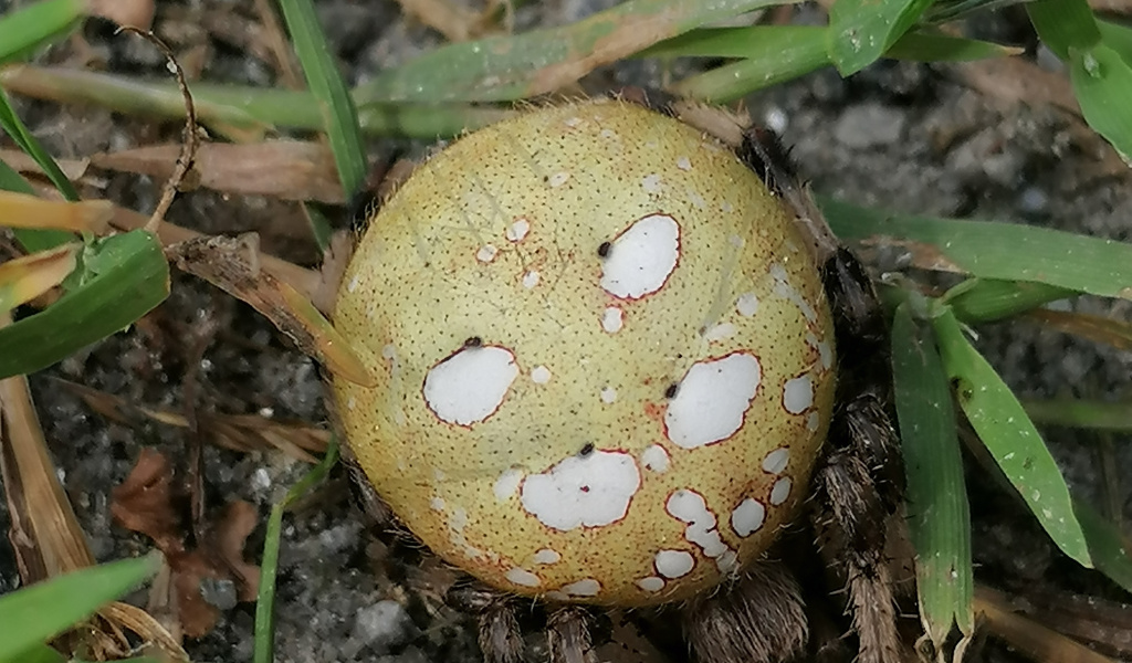 Man muss schon genau hinschauen, um die vielen kleinen Lebenwesen auf solch einer Wiese wahrzunehmen. Hier handelt es sich um eine Vierfleckkreuzspinne. Die Art ist nicht bedroht aber man beobachtet sie viel seltener als andere Spinnen, weil sie sich fast nie in der Netzmitte aufhält und damit nicht so gut zu entdecken ist.