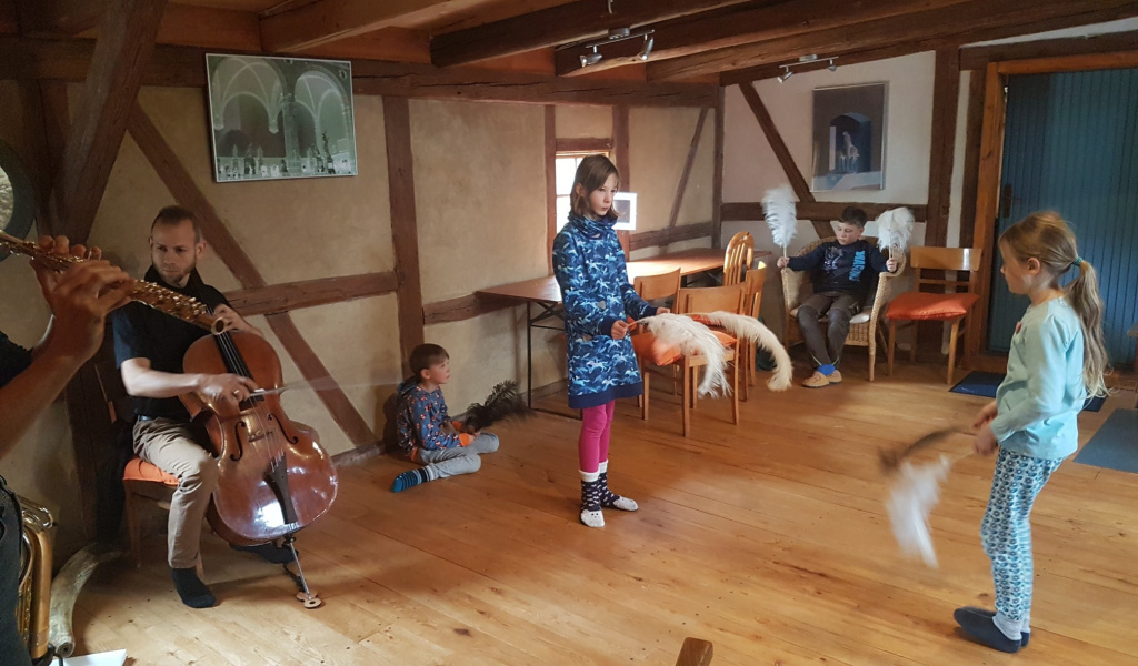Gemeinsam sahen wir uns Filmausschnitte zu heimischen und auf Wunsch auch zu exotischen Vögeln zur Inspiration an. Einige Kinder hatten sogar Bücher, Aufzeichnungen und auch Kostüme mit. Wir schauten uns Spechte, Eisvögel, Amseln sowie tanzende Kraniche an. Besonders die Straußenfedern regten die Phantasie auf wunderbare Weise an, sich mit Flügeln tanzend und fliegend wie Vögel durch den Raum zu bewegen. Höhepunkt war natürlich der unmittelbare Einsatz von exzellenten Profimusikern und alle samt MeisterInnen der Improvisation auf ihren Instrumenten (Moriana Krause/ Uruguay, Querflöte; Michael Winkler, Trompete, Tuba, Posaune, Didgeridoo; Matthias Hübner, Cello) mit denen sie Vogelstimmen und Geräusche imitierten. Es ist immer wieder toll zu erleben, wie begeistert die Kinder auf improvisierte Klänge reagieren und ihre Empfindungen in Bewegung transformieren können, wenn sie gelassen werden. Es waren für sie sehr ungewöhnliche Geräusche, doch die Hemmungen schwanden schnell. Eine tänzerische Anleitung erfolgte durch Francesca Mommo aus Italien, die ebenfalls einfühlsam die Kinder zu individuellen Bewegungen zu animieren wusste.